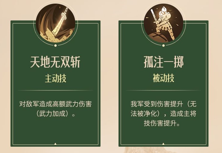 被动:我军受到伤害提升(无法被净化),造成主将技伤害提升。