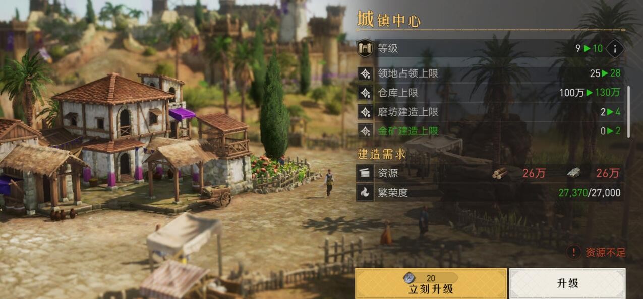 作为整个领地最重要的核心建筑,城镇中心中心的等级是其他所有建筑的上限。并且随着它的升级,我们还能开启更多的功能建筑,占领更多资源领地。包括至关重要的时代升级,也需要在城镇达到一定等级才能提升。