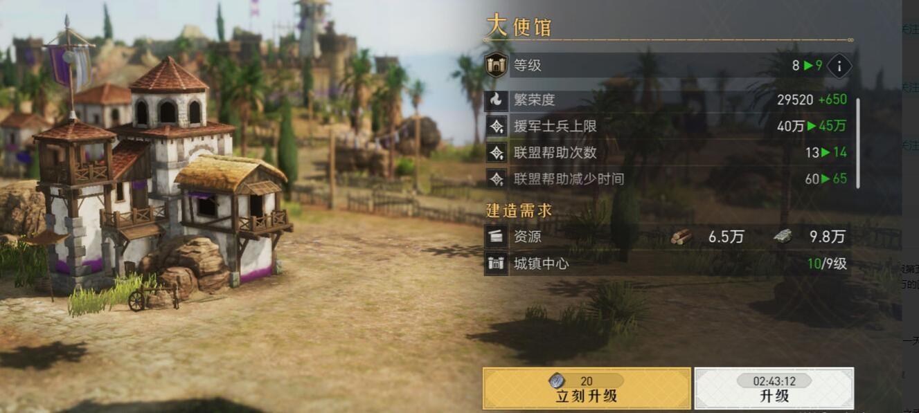 大使馆升级所提升的,是联盟支援以联盟帮助的时间和次数,将它提升到一定等级后,会对你后续的建设速度有不小的提升。