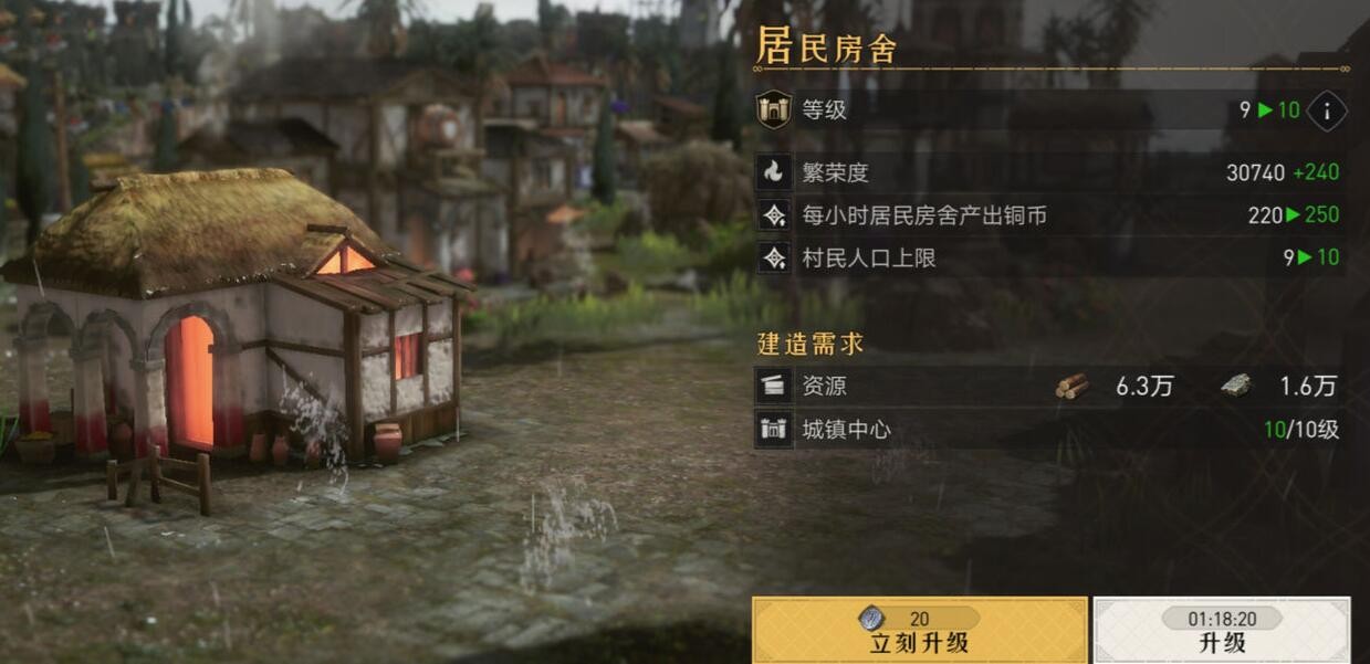 最初的几级消耗少,建设时间短,我们可以一次性升完,但是此后不建议升太多,因为短期内我们要尽可能把资源留给城镇中心。