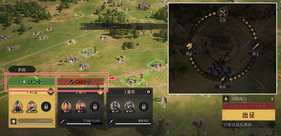 例如你是骑兵主力,那就应该找弓兵打,剑士就应该找枪兵打,这样才能最大的缩小战损,减少粮食损耗以及等待治疗的时间。