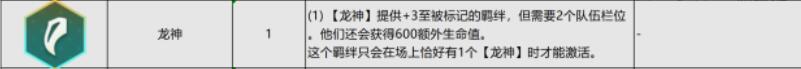 羁绊效果:【龙神】提供+3至被标记的羁绊,但需要2个队伍栏位,他们还会获得600额外生命值,这个羁绊只会在场上恰好有1个龙神时才能激活