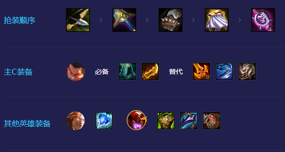 瑟提:主力输出,需求水银(必备)、杀人剑、羊刀或火炮;希瓦娜:主力前排,需求狂徒、反甲或者龙牙等其他防装;有冰心可以给凯隐打控制,有多余的输出装给霞。