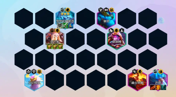 后期阵容:8人口找到2星赫里卡姆和2星迭嘉,如果努努没有3星,那么继续找3星努努。后期如果有多余的经济可以追下3星艾维尼亚,正常情况下是没有太多的经济去拉9人口的。
