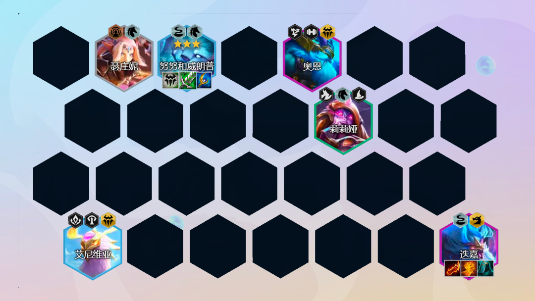 后期阵容:8人口找到2星赫里卡姆和2星迭嘉,如果努努没有3星,那么继续找3星努努。后期如果有多余的经济可以追下3星艾维尼亚,正常情况下是没有太多的经济去拉9人口的。