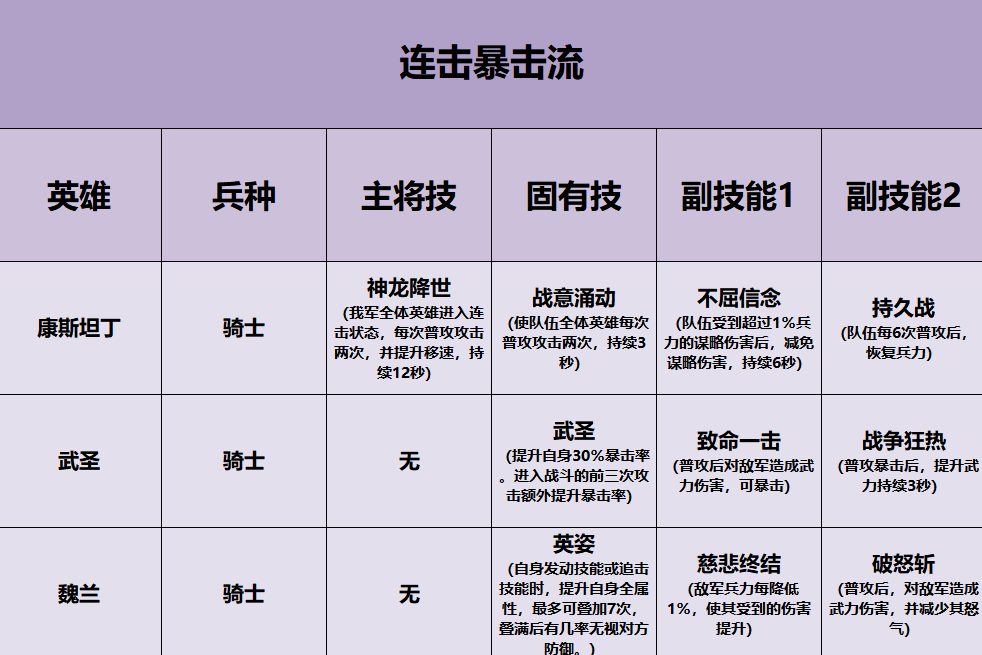 进阶搭配则是依据英雄技能搭配,如:康斯坦丁+武圣+魏兰。这样搭配,完美运用上康斯坦丁的主将技,再搭配三个英雄各自的固有技和装备的副技能,使队伍提升武力、攻击速度、暴击率,队伍的战斗能力大幅提升。