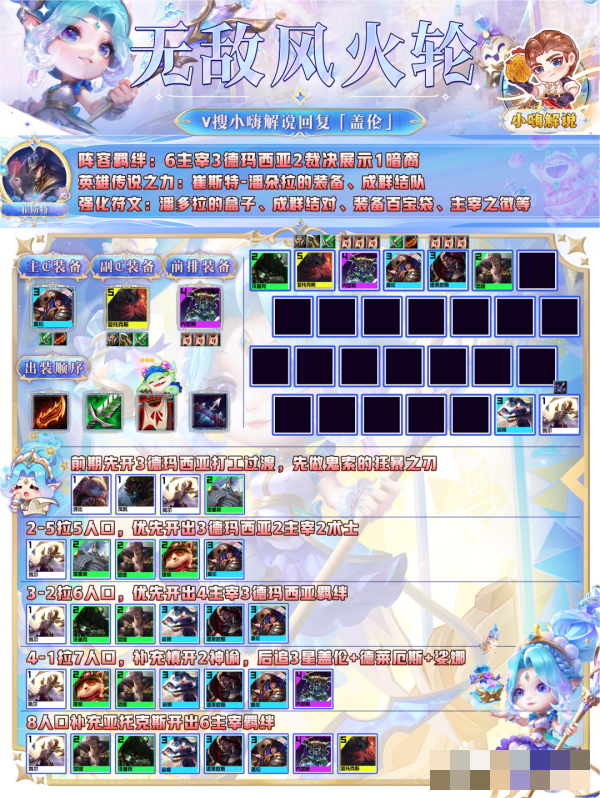 8.2阶段:2-1拉4人口,2-5拉5人口,前期用3德玛西亚2主宰2术士羁绊打工,也可以用4主宰过渡。尽可能灵活打连胜,选秀阶段无视一切装备,直接拿盖伦>德莱厄斯>其他德玛西亚的装备。