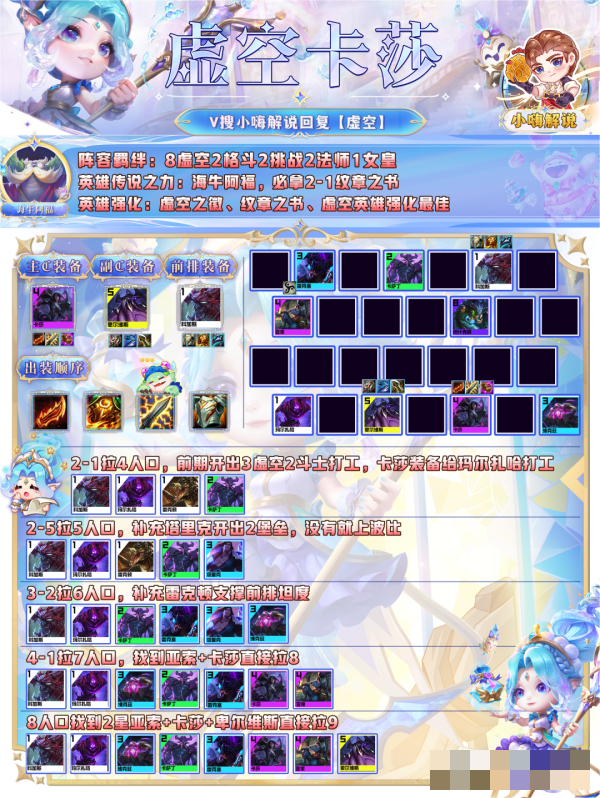 6.阵容运营:这套阵容就是【虚空纹章】,8虚空和6虚空是两套阵容,如果在4、5阶段没有虚空纹章的情况下,建议后期考虑转去玩其他输出阵容。