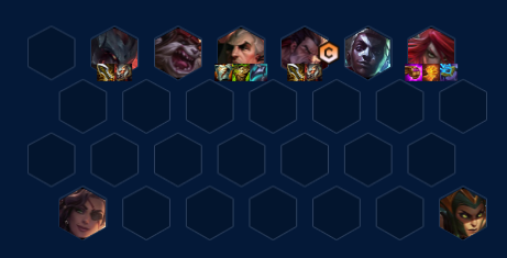 前期过度这边推荐3诺克和2挑战2裁决打工,2-1拉4,最好能连胜,五人口补一张劫去拿诺手装备打输出就可以。