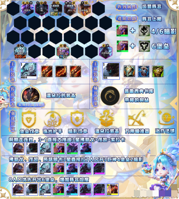 阵容必须要拿崔斯特的潘多拉装备,否则无法做出全员神装,特别是佛耶戈的装备非常重要。