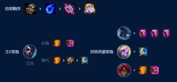 法爆给艾克提供伤害,双正义可以保证提高伤害的同时有回复,提升残局能力。备选泰坦。因为该阵容几乎没有副c,所以杯子是提高主C伤害最好的装备。