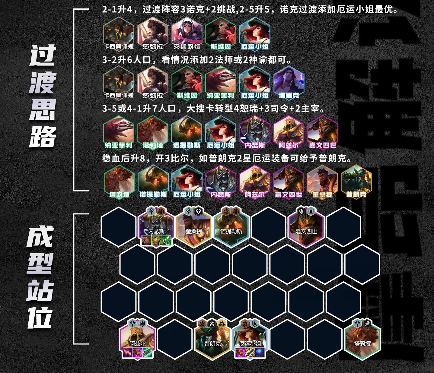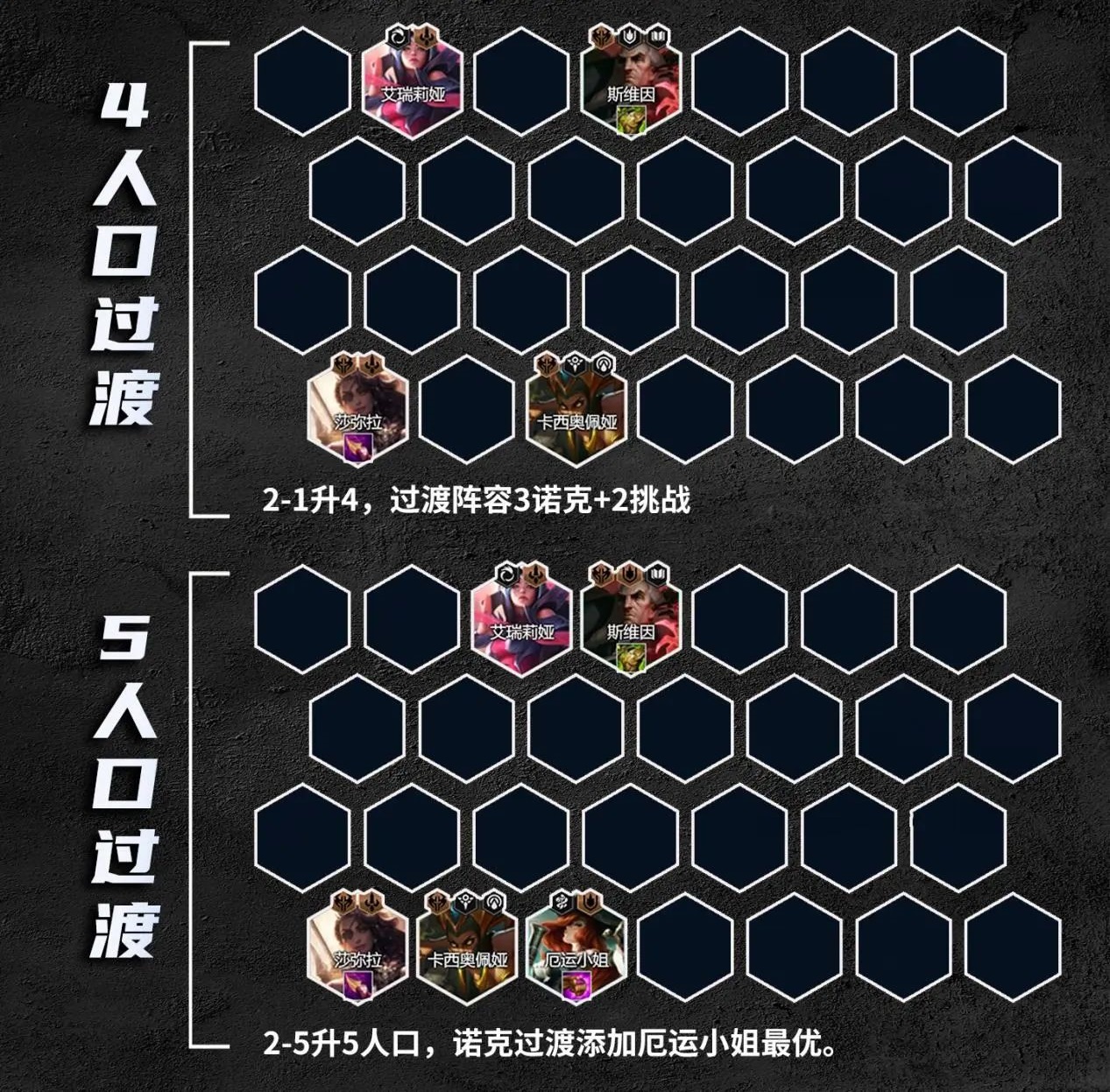 2-1升4,2-5升5,过度阵容建议3诺克+2挑战+2司令最优,其他3艾欧,3虚空,3德玛西亚或堡垒/格斗+2潜行也都可考虑,连胜强度也比较不错。