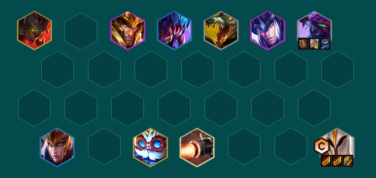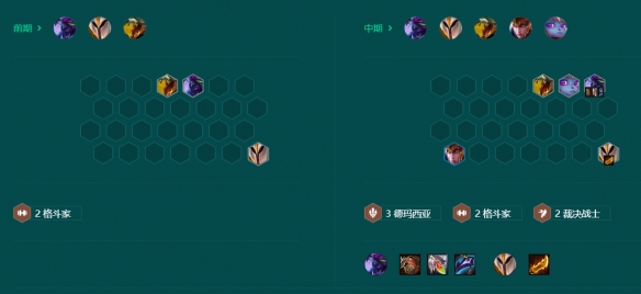 石头怪打完直接梭哈,追三星的凯尔,雷克顿,科加斯。可以顺带留一下波比和奎因,奎因可以先不升两星,把更多的经济用来追1费卡的三星。5人口就上三德玛西亚和两格斗家两裁决战士。