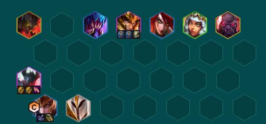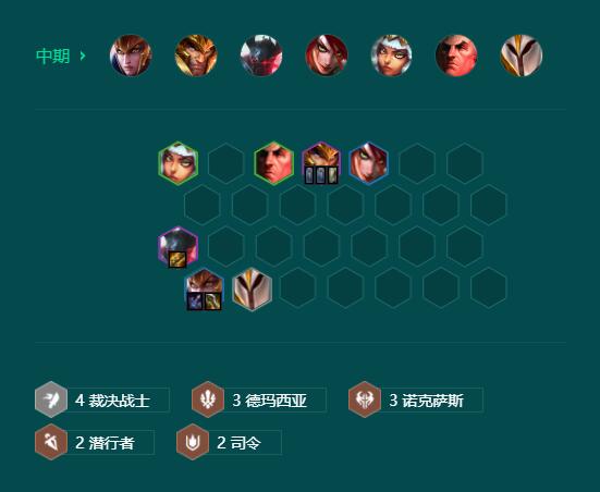 阵容羁绊:6 裁决战士、3 德玛西亚、3 诺克萨斯、2 潜行者、2 格斗家、1 暗裔