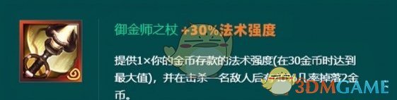 提供1×你的金币存款的法术强度(在30金币时达到最大值),并在击杀一名敌人后有40%几率掉落2金币。