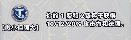 4、微小但强大:你的1费和2费弈子获得10/12/20%攻击力和法强。
