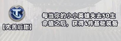10、先苦后甜:每当你的小小英雄失去50生命值之后,获得4件基础装备。