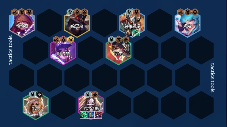 8人口补阿卡丽开KDA格子。站格子吃加成,很多时候一星的死歌搭配铁男都可以和大部分阵容对抗了,有两星死歌还是推荐大家存钱上9再拉高上限。基本8人口也能打到底了,今天也是连续吃鸡了几局,8人口这套也能打赢10人口7kda的阿卡丽。