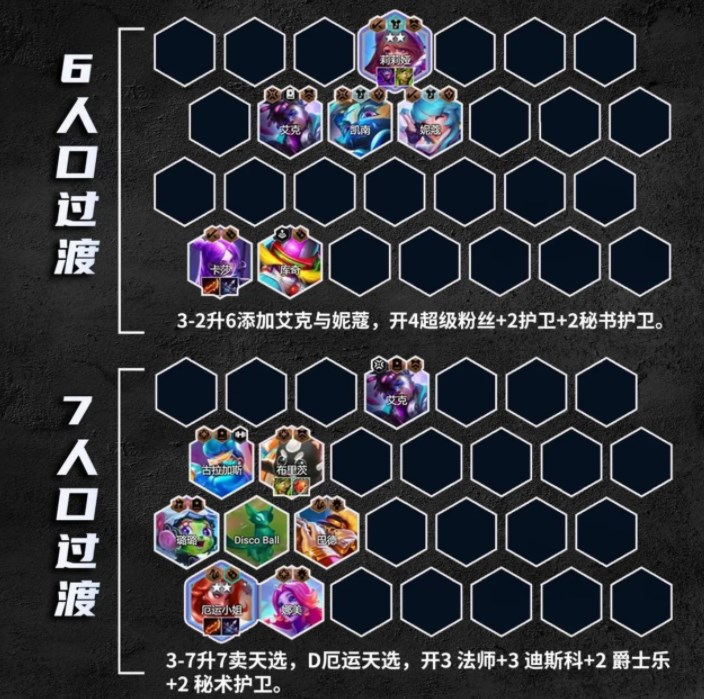 1、2-1升4人口、2-3/5升5人口,看天选搭配过渡阵容,有啥用啥,比较建议用3KDA+3超级粉丝+2大腕射手过渡最优。
