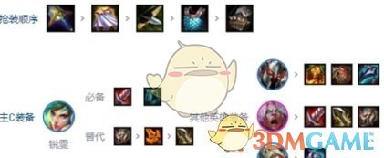 1、装备方面这套阵容的主要输出是锐雯,所以饮血和水银是必备的,剩下一件给输出装就可以泰坦最好,多余的肉装给铁男,佛爷消化多余的装备。