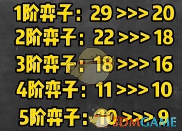 1、1阶弈子由29张减少至20张。