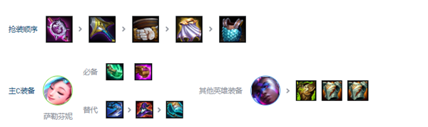 1、主c萨勒芬妮的装备优先给青龙刀和法爆,剩下的意见装备给随便输出装就可以,艾克捡多余的肉装当前排。