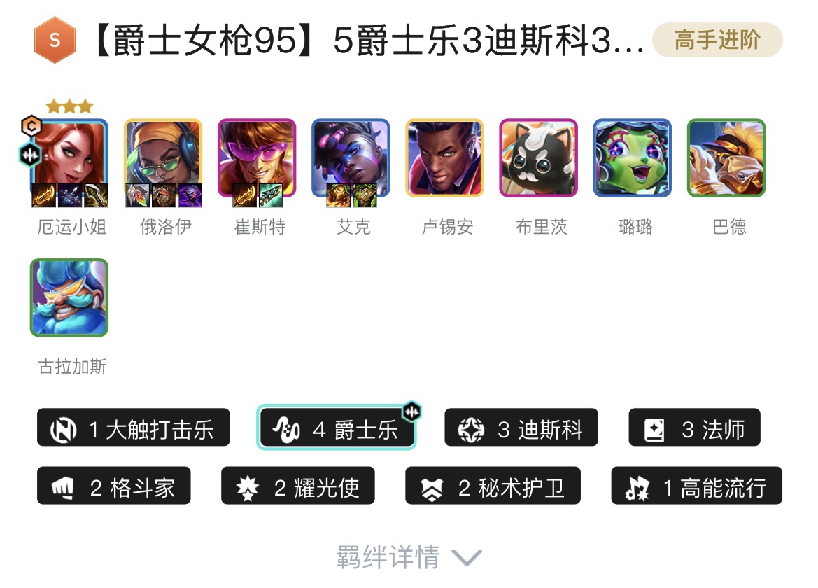 1大触打击乐、4爵士乐、3迪斯科、3法师、2格斗家、2耀光使、2秘术护卫、1高能流行