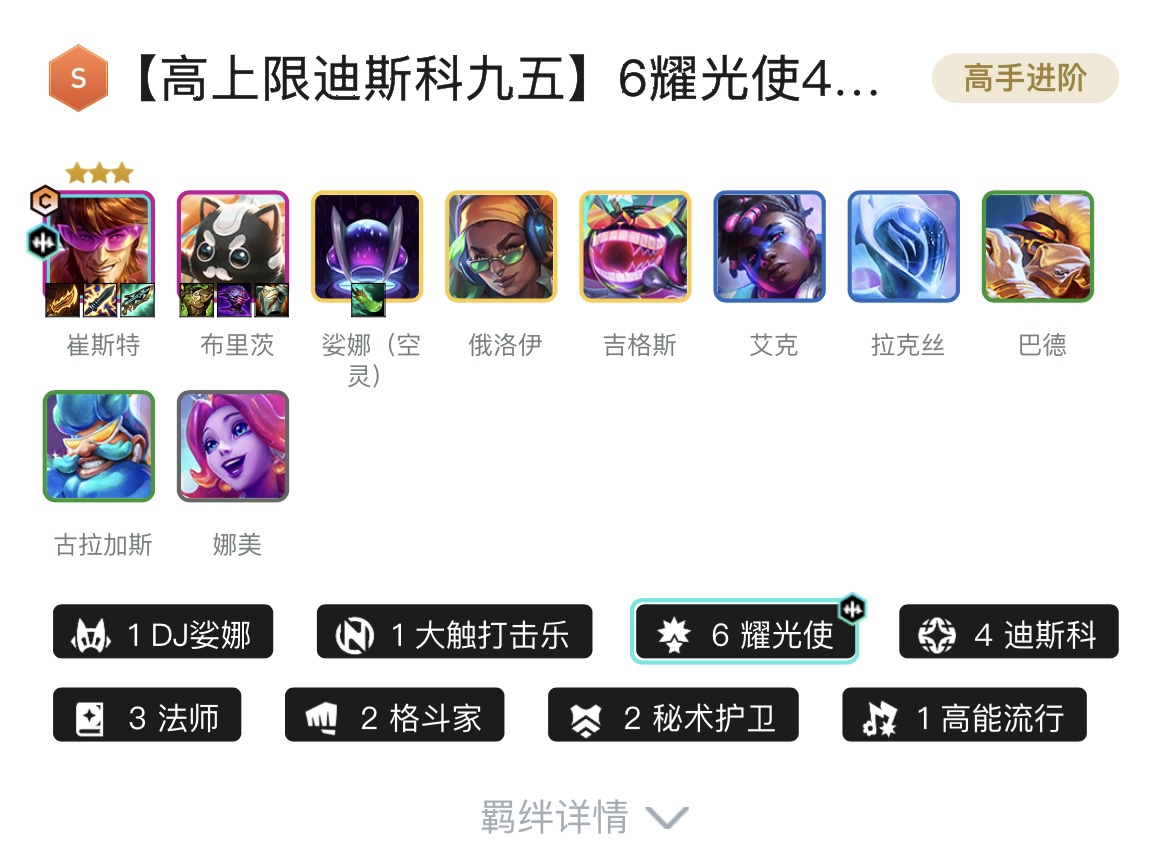 1DJ娑娜、1大触打击乐、6耀光使、4迪斯科、3法师、2格斗家、2秘术护卫、1高能流行