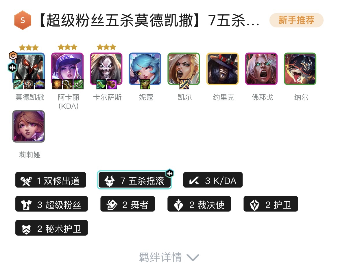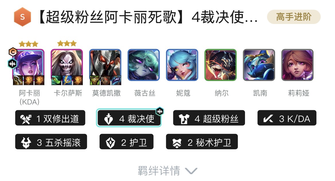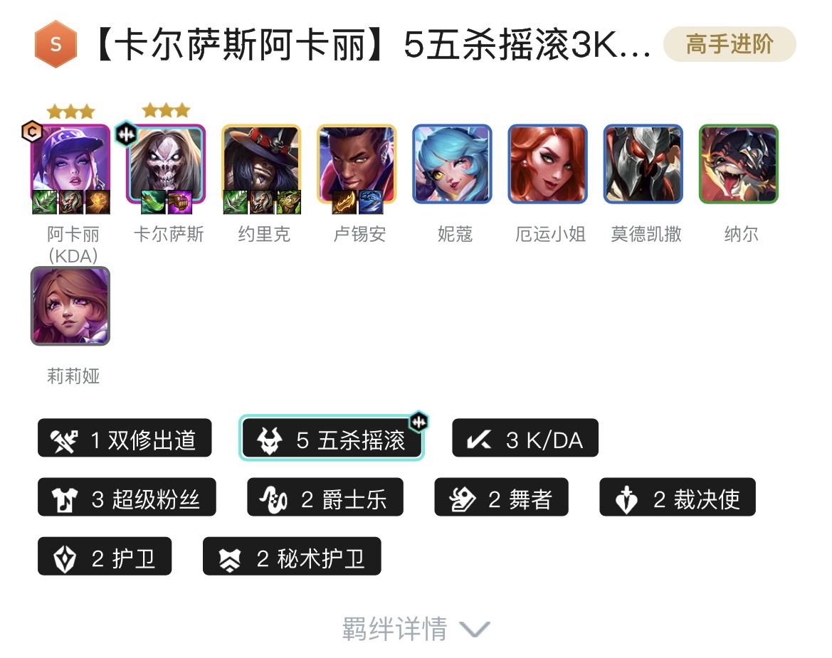 1双修出道、7五杀摇滚、3K/DA、3超级粉丝、2舞者、2裁决使、2护卫、2秘术护卫