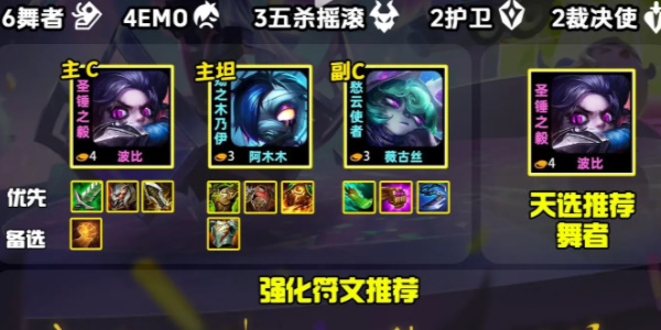 4、4-2拉8,大D找出基础阵容6舞者4EMO,随后慢D全员2星再拉9级。约里克没来找其他舞者代替!天选舞者波比最优,如是天选EMO就下掉安妮。