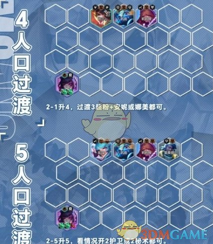 2-1升4,2-5升5人口,开局有啥天选用啥,比较建议3超粉+安妮或娜美都可。装备优先合成朔极之矛与狂徒、坚定之心。之后在考虑珠光与其他坦度装备。