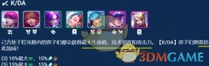 阵容开了5KDA羁绊,这样就给全员增加15%生命值与攻击力和法球,特别是KDA棋子们能获得双倍加成(30%),这样就能大幅度增加前排坦度和后排双C萨勒芬妮与阿狸的输出强度。