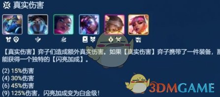 真实伤害羁绊不仅能无视敌方弈子的抗性,造成额外的真实伤害,关键是还会给携带了装备的真实伤害弈子一个闪亮加成,最关键的是阿卡丽的闪亮加成让其技能有20%的吸血,大幅度增加了阿卡丽的续航能力,在面对一些抗性较高的弈子或阵容有着天然的优势。