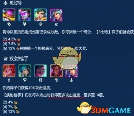 凯特琳是8比特与疾射枪手羁绊,8比特羁绊能为比特棋子提供攻击力,而疾射枪手羁绊能为队伍增加10%的攻速,关键的是疾射枪手棋子每次普攻提供4%的攻速加成,最高可叠加10次(40%攻速),这样凯特琳普攻技能释放频率均能大幅度加快。