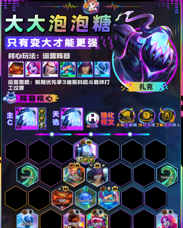 1.金铲铲之战大大泡泡糖阵容组成:塔姆、酒桶、瑟提、娜美、拉克丝、扎克、卡牌、吉格斯、俄洛伊