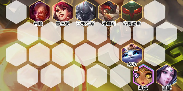 1、阵容组成:布隆、科加斯、诺提勒斯、瑟庄妮、亚托克斯、悠米、妮蔻、迦娜