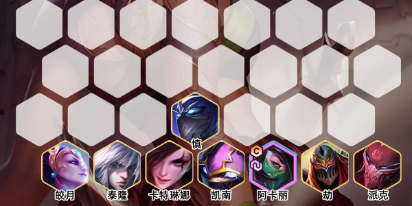 1、阵容组成:慎、皎月、泰隆、卡特琳娜、凯南、阿卡丽、劫、派克