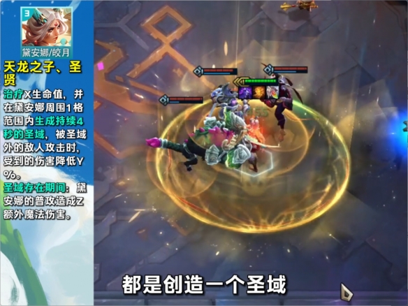 治疗自己生命值并生成一片圣域,持续 5 秒。黛安娜攻击时会对圣域范围内的敌军造成额外魔法伤害,并减少来自圣域范围外的 40% 伤害。