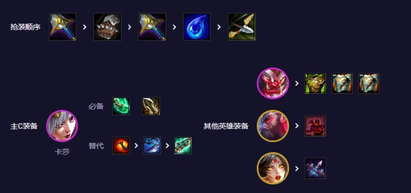 1、卡莎无尽无争议必做,第二件青龙刀就能快速打出第二段大,只有减员,己方前排才能存活下来,形成以多打少局面,红和轻语都是好装备,但你可以让其他迅射带轻语,以及提莫带鬼书来平替。