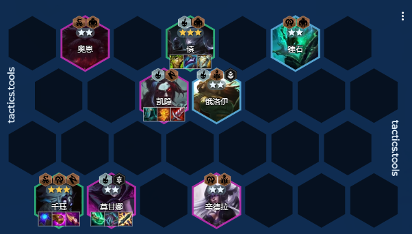 血量和质量尚可的情况下我们可以选择上9下锤石换万豪,再补上丽桑卓处理很肉的前排或者挂猴子补圣贤。