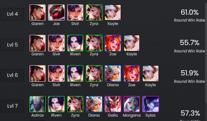 要点2:前期最好要打出连胜,同时要先满足莫甘娜和加里奥的肉装,最好合一个电刀破后排的法抗,莫甘娜能不能将后排直接烫死至关重要。同时如果大剑开局多也可选择八级的时候挂盲僧/凯影等下位替代(因为他们的装备不相通法系和物理,仅在开局大剑多不好消耗推荐,后续再转圣贤天龙95)