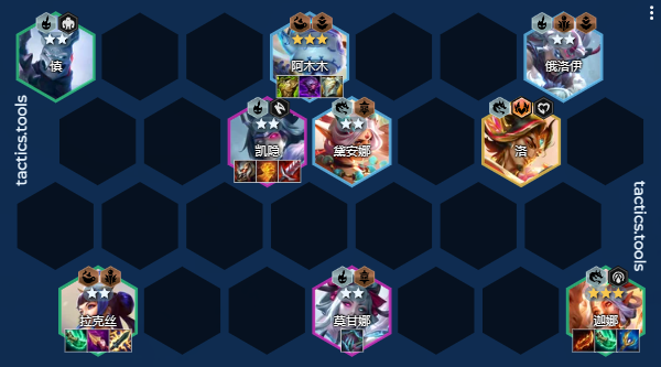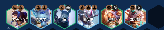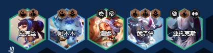 这套阵容在3阶段基本双星之后的锁血能力比较好,前期是阿木木肉,配合拉克丝的眩晕,对赌前排的阵容比较克制。