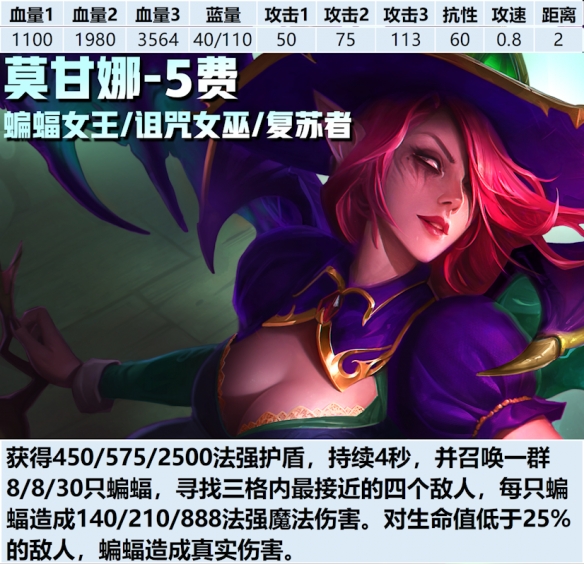 蝙蝠女王:莫甘娜技能击杀敌人时有45%的概率获得这个弈子的1星复制品或者拿到被击杀弈子穿戴的1件基础装备。