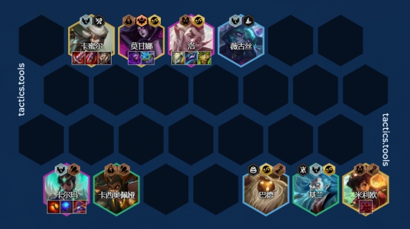 7卡尔玛、洛两星开出4时间学派和复苏的羁绊后,血量多选择上9找到米利欧、青钢影和莫甘娜等五费即可