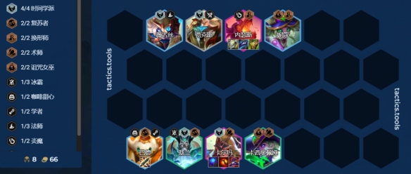 羁绊:4复苏 4时间学派 2学者 2术师 2花仙子 2诅咒女巫