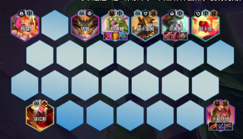 站位方面卡特前排挨打先手给重伤和AOE伤害,剑姬对位对手C位有概率秒杀对手C位,滑板鞋跟剑姬站同侧提供破甲,更快过掉对手前排,有泽拉斯命运给他!
