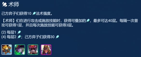 阵容开2术师羁绊,不仅开局增加法强,每次普攻都可增加法强,2羁绊下最多给卡西奥佩娅增加50法强,这样3星卡西奥佩娅技能普攻可最多造成485魔法伤害。