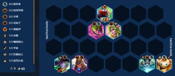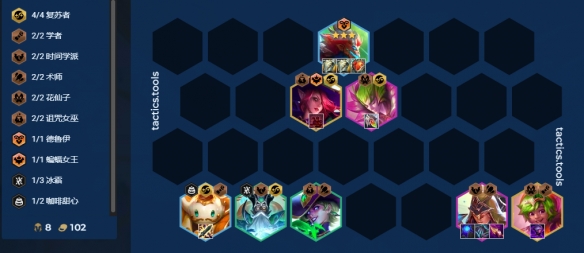 羁绊:4复苏者 2学者 2时间学派 2术师 2花仙 2诅咒