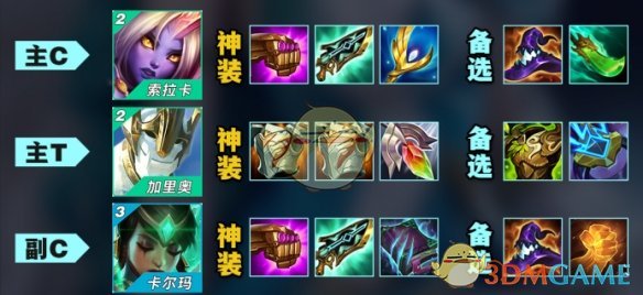 这套阵容特别适合新玩家,s9的第一套阵容,成型简单,强度也很高!加里奥和奶奶成型后,一个巨肉,一个巨能奶!6级出索拉卡、加里奥3星,后续拉人口补齐阵容即可!如果有转职8级补瑞兹开6神谕伤害更离谱!