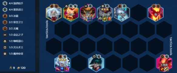 优先推荐冕卫+狂徒的组合,能在开局就触发重装带护盾的伤害减免效果,其次带离子的情况,也可带饮血,三星之后有很强的单C能力